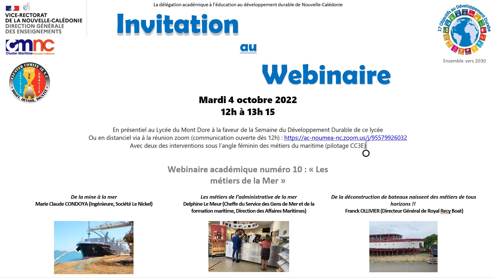 Nous vous convions à un webinaire académique " Les métiers de la Mer " le mardi 4 octobre 2022 de 12h à 13h15.
