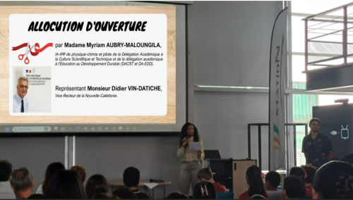 Madame Myriam AUBRY-MALOUNGILA, IA-IPR de Physique-Chimie, déléguée académique à la culture scientifique et technique (DACST), et déléguée académique à l’éducation au développement durable (DA-EDD) a adressé quelques mots, au nom de Monsieur le Vice- recteur de la Nouvelle-Calédonie, aux nombreux élèves, étudiantes et étudiants présents à ce temps de valorisation de leurs travaux.