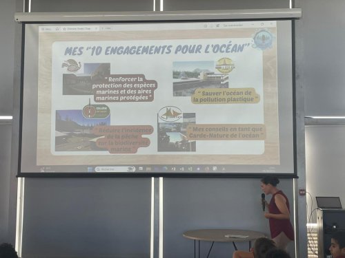 Madame Myriam AUBRY-MALOUNGILA a rappelé que l’offre éducative académique 2025, a permis à plusieurs élèves et étudiants, de mener une réflexion approfondie sur des solutions, qu’ils ont estimé les plus pertinentes possibles, pour préserver et soutenir un Océan sain et durable sur le long terme. En fonction de leur appétence et de leur motivation, les élèves ont emprunté plusieurs modalités d’expression. Certains ont préféré faire entendre leurs voix et adresser des propositions concrètes pour protéger l’Océan, alors que d’autres ont souhaité écrire l’avenir de l’Océan, dans le cadre de travaux collectifs, nourris par la communauté scientifique de la Nouvelle-Calédonie (Institut Pasteur, IRD, UNC, AFD, Météo France).